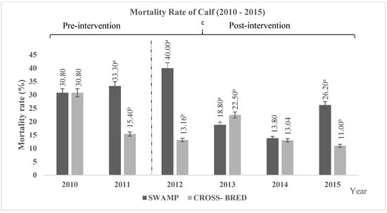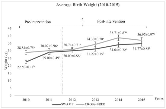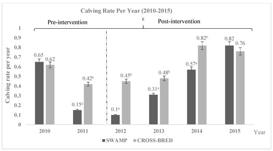 Total number of calving rates per year of Swamp and Murrah crossbred buffaloes between 2010 to 2015. There are increasing patterns for both breeds, and the crossbred buffaloes show significantly (p < 0.05) higher number than the Swamp buffaloes. a,b Different superscripts indicate significant difference of calving rate at p < 0.05; c indicating significant (p < 0.05) difference comparing between pre- and post-intervention. There is no significantly different (p > 0.05) interaction between number of calves born with different years of birth and pre- and post-intervention.