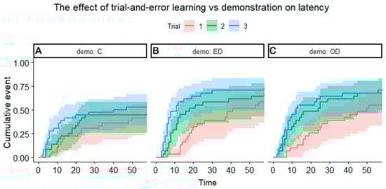 (A) Trial-and-error learning had a weak effect on learning the detour task. Dogs solved the detour faster after the demonstration both when (B) the experimenter demonstrated the task and (C) the owner demonstrated the task. There was no significant difference in the latency between the second and third trials. Abbreviations: demo: C = control; demo: ED = experimenter demonstration; demo: OD = owner demonstration.
