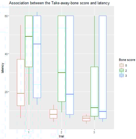 We also found a significant association with the variable “shaping.” The more a dog was trained with the method of shaping, the faster it solved the detour task (95% CI = (1.054–1.260), Z = 3.1, p = 0.0019). Behaviour in the Take-away-bone test also associated with the dogs’ latencies in the detour test: post-hoc tests showed that dogs who immediately let go of the bone solved the task faster than dogs that only gave it up when the artificial hand rested on it (95% CI = (1.782–12.604), Z = −3.12, p = 0.0156) or only after some tugging (95% CI = (1.853–10.646), Z = −3.35, p = 0.0074), and this association was only significant after the demonstration (in trials 2 and 3) (Figure 4).