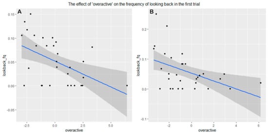 More “Overactive” dogs looked back less frequently at the owner in the first trial in both the (A) experimenter demonstration group and (B) owner demonstration group.