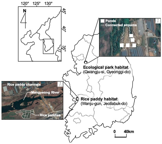 Gold-spotted pond frogs are typically found in wetland environments. Therefore, when alternative habitats are created to protect their populations, the establishment of artificial habitats such as ecological parks is often considered [27]. We selected Gyeongancheon Ecological Wetland Park in Gwangju-si, Gyeonggi-do (37°27′26.91″ N, 127°18′15.22″ E) and rice paddies on opposite sides of Hali Bridge on the Mankyeong River in Wanju-gun, Jeollabuk-do (35° 53′ 26.60″ N, 127° 05′ 55.92″ E) as the study sites, which were designated as ecological park and rice paddy habitats, respectively (Figure 1).