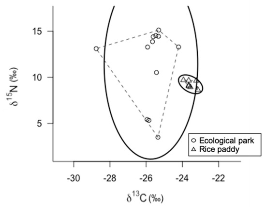 δ13 C-δ15 N bi-plot of gold-spotted pond frogs (Pelophylax chosenicus) captured from an ecological park wetland habitat (circles) and a rice paddy habitat (triangles); for each habitat, dashed lines indicate the convex hull areas (TA) and solid lines indicate the ellipse areas with p = 0.95 (n = 100).