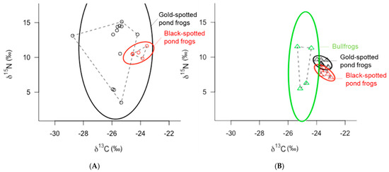 δ13 C-δ15 N bi-plot of gold-spotted pond frogs (Pelophylax chosenicus; black), black-spotted pond frogs (P. nigromaculatus; red), and bullfrogs (Lithobates catesbeianus; light green) captured from (A) an ecological wetland park habitat (circles) and (B) a rice paddy habitat (triangles): dashed lines indicate the convex hull areas (TA) and solid lines indicate the ellipse areas with p = 0.95 (n = 100).