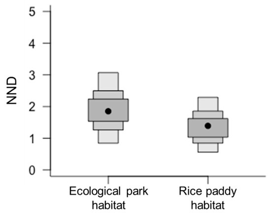 Comparison of community-wide metrics (mean nearest neighbor distance; NND) between ecological wetland park and rice paddy habitats, based on the posterior distribution of the means of each community’s carbon and nitrogen stable isotope ratios; mean NND: 1.78 in ecological wetland park habitat, 1.44 in rice paddy habitat.
