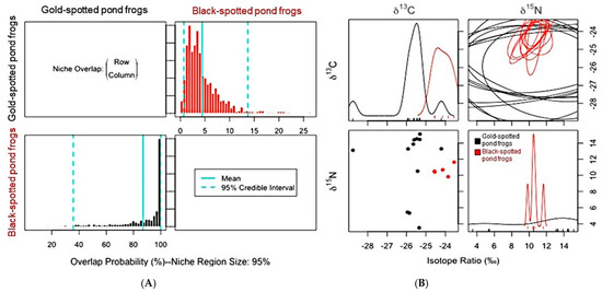 Gold-spotted pond frogs have a high preference for active food sources which have a low probability of being consumed by black-spotted pond frogs [19]. Therefore, there is a low probability of gold-spotted pond frogs restricting the food sources which are available to black-spotted pond frogs in environments with abundant food sources; however, when food sources which are preferred by both species are abundant, there is a probability of larger amounts of such foods being consumed by black-spotted pond frogs, explaining why the ENS overlap probability of gold-spotted pond frogs by black-spotted pond frogs appeared high in ecological wetland park habitat [19]. In contrast, in the one-dimensional density plot of the C stable isotope ratios of the gold-spotted and black-spotted pond frogs in the rice paddy habitat, the isotope ratio ranges tended to be similar. However, only some parts overlapped in the one-dimensional density plot of N stable isotope ratios (Figure 6B). Based on these findings, the two species consumed food sources that had similar basal resources but different trophic positions in the rice paddy habitat and, as a result, exhibited low overlap probability. The probability of gold-spotted pond frogs overlapping the ENS of black-spotted pond frogs increased slightly, likely because of food source overlap following a decrease in food sources that were highly preferred by gold-spotted pond frogs in the rice paddy habitat, which had relatively low trophic diversity.