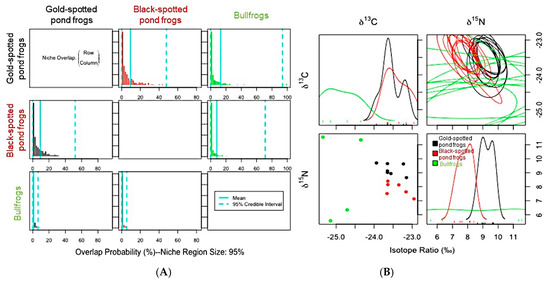 (A) Posterior distribution of the probabilistic niche overlap metric (%), niche region size (α) = 0.95 indicating the probability of one species (row) overlapping onto the niche of another species (column) among gold-spotted pond frogs (Pelophylax chosenicus), black-spotted pond frogs (P. nigromaculatus). and bullfrogs (Lithobates catesbeianus) in a rice paddy habitat. (B) One-dimensional density plots of each carbon and nitrogen stable isotope; top-left and bottom-right, respectively, elliptical projections of isotopic niche regions for each species and pair of stable isotopes; top-right, and two-dimensional scatterplots; bottom-left.