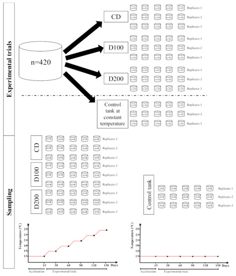Then, specimens were randomly distributed in 12 cylindrical fiberglass 2000-L tanks (4 treatments × 3 replications; n = 35 individuals per tank). Nine tanks were exposed to same temperature conditions because they were inter-connected and linked to a re-circulating system, with a water flow of 7200 L/h (about eight total volume renewal per day) and equipped with mechanical and UV filters, a skimmer, a 3000 L biological filter and a 3000 L/h heat/cool pump. Ten percent of the water volume was renewed with reconstituted water every week. These tanks were placed in an air-conditioned room to support the increase in water temperature and to avoid heat loss during the experimental trial. There was constant aeration of the water with supplemental oxygen to keep dissolved oxygen values within the optimal range. Fish were progressively exposed to five experimental temperatures: 15, 18, 21, 23, and 25 °C, which reflected the natural water temperature range occurring in the southern Mediterranean region from mid-winter to mid-summer (https://www.seatemperature.org, accessed on 4 November 2019) (Figure 1). The water temperature was monthly increased regularly (2–3 °C month−1) according to the seasonal trend. Four days before starting each exposure phase, water temperatures were progressively increased by 0.50–0.75 °C. After this period, the required experimental temperatures were kept constant for the remaining 26 days. The other three tanks were used as control at constant temperature (data not shown). These ones were placed in a different air-conditioned room and water temperature was constantly kept through a heat/cool pump at 13 °C during all the experimental trial (Figure 1). The tanks were linked to re-circulating system with a water flow of 2400 L/h (about eight total volume renewals per day) and equipped with mechanical and UV filters, a skimmer, a 1000 L biological filter and a 1000 L/h heat/cool pump. In control tanks, constant aeration of the water was sufficient to maintain optimal dissolved oxygen values. All tanks were maintained at a 14:10 L: D light–dark regime. During the experimental trial, the water quality parameters (e.g., temperature, dissolved oxygen, pH, total ammonia, nitrite, and nitrate) were monitored daily. Data about water temperature, dissolved oxygen, pH and salinity were collected by means of a tester HI-9829 (Hanna Instruments, Padova, Italy) whereas total ammonia, nitrite, and nitrate were measured with colorimetric kit (Testlab Marin, JBL). The mean temperature values during each exposure phase were 13.05 ± 0.03 °C; 15.35 ± 0.01 °C; 17.90 ± 0.08 °C; 21.20 ± 0.01 °C; 23.15 ± 0.03; and 25.07 ± 0.21 °C. These range values were marked as groups 13, 15, 18, 21, 23, and 25 °C. During the 150-days experimental period, specimens were maintained under the following conditions: 7.4 ± 0.5 mg/l of dissolved oxygen, 7.5 ± 0.1 of pH and 30 ‰ ± 2 of salinity. Ammonia (NH4+), nitrite (NO2−), and nitrate (NO3−) concentrations were kept below 0.05 mg/L, 0.20 mg/L, and 2.0 mg/L, respectively.