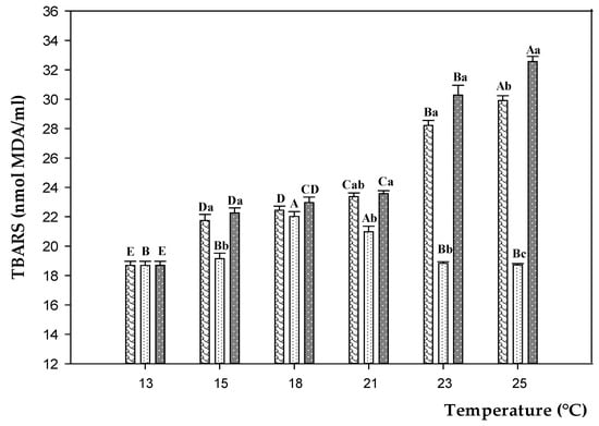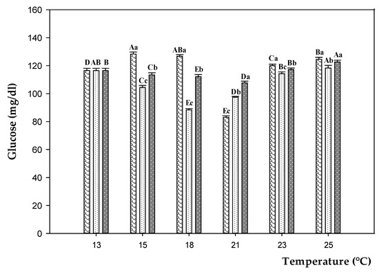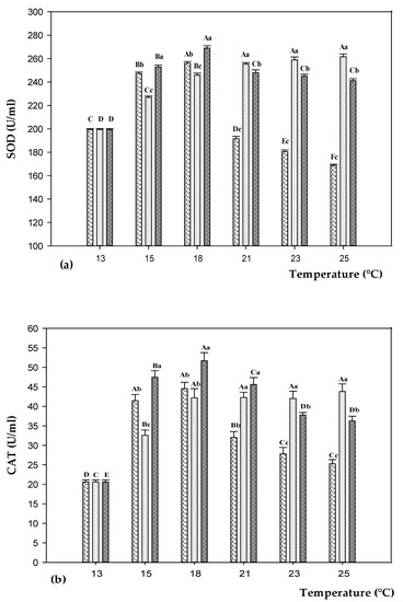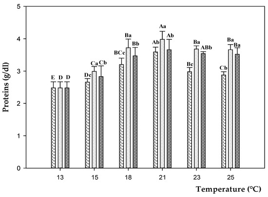 ) and, exposed to different water temperature (13, 15, 18, 21, 23, and 25 °C). Data are reported as means ± standard deviations (at each temperature value, n = 12 per treatment). Different capital letters (A–E) indicate significant differences (p < 0.05) among water temperature within the same diet. Different lowercase letters (a–c) indicate significant differences (p < 0.05) among diets within the same water temperature.