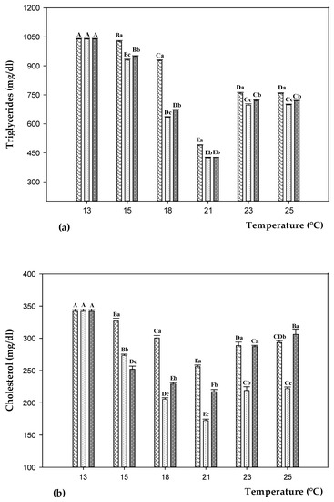 Serum triglycerides levels also showed a temperature-related trend (Figure 5a and Supplementary Table S1). The triglycerides content decreased switching from 13 to 21 °C (minus 53–59%) under all experimental conditions. In particular, a dramatic drop was observed between 15 and 18 °C in D100 and D200 groups (minus 32 and 29%, respectively). Switching from 21 to 23 °C, the trend was inverted (plus 55–69%). No changes (p > 0.05) were observed between 23 and 25 °C. Overall, the lowest (p < 0.05) triglycerides levels were always found in D100 and D200 groups. A similar pattern was observed for cholesterol levels (Figure 5b and Supplementary Table S1). Switching from 13 to 21 °C, the cholesterol content constantly went down (minus 25–50%) (p < 0.05) under all experimental conditions. Within the range 15–21 °C, the lowest (p < 0.05) values were recorded in fish fed on both D100 and D200. At 23 °C the cholesterol levels significantly (p < 0.05) increased in all groups (plus 13–32%) with respect to 21 °C. Switching from 23 to 25 °C a slight increase (p < 0.05) was found (plus 7%) only in fish fed on D200, whereas no changes (p > 0.05) were observed in CD and D100. Within the range 23–25 °C, the lowest (p < 0.05) values were recorded in fish fed on D100.