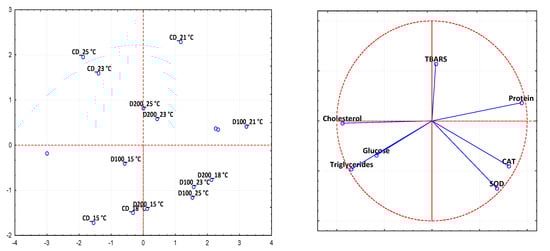 Score (a) and loading (b) plots of first and second principal components after principal component analysis performed on oxidative stress biomarkers and serum biochemical parameters in sea bass fed on control diet (CD) and experimental diets with different concentration of oregano essential oil (100 ppm (D100) and 200 ppm (D200)) and, exposed to different water temperatures (13, 15, 18, 21, 23, and 25 °C).