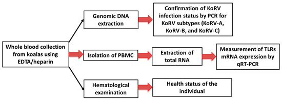 In this study, we targeted a total of 11 captive koalas (three males, eight females; age range: 6 months to 12 years) maintained in an air conditioning system (23–25 °C) in two Japanese zoos (Hirakawa Zoological Park, Kagoshima, Japan, and Kobe Oji Zoo, Kobe, Japan) to investigate TLR expression patterns in PBMCs infected with KoRV-A or KoRV-A with KoRV-B and/or -C. Tissues were collected from two koalas (KM and Joey), including one adult female koala (KM) that died at a later point in the study period [38], and its bone marrow was included for tissue expression analysis of TLRs, together with spleen and lung tissue from a joey reported in a previous study [18]. Koala whole blood samples were collected from 10 koalas (KJ, KY, KYB, KM, K1, K2, H8, KS, H7, H9) using heparin or EDTA by venipuncture between January 2019 and November 2020. The infection status of koalas was confirmed for three KoRV subtypes, KoRV-A (the endogenous subtype), and KoRV-B and KoRV-C (exogenous subtypes). A workflow of the study has been indicated in Figure 1. This study was performed following the protocols of the Institutional Animal Care and Use Committee of the Joint Faculty of Veterinary Medicine, Kagoshima University, Japan.