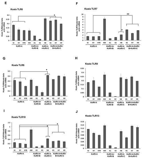 Expression profile of TLR mRNAs in koala peripheral blood mononuclear cells (PBMCs). Expression patterns of TLR2 (A), TLR3 (B), TLR4 (C), TLR5 (D), TLR6 (E), TLR7 (F), TLR8 (G), TLR9 (H), TLR10 (I), and TLR13 (J) mRNAs are indicated in koala PBMCs infected with different KoRV subtypes. Koala beta actin mRNA was used for normalization of the transcript levels of the TLRs. Statistical significance was calculated using the Student’s t-test and indicated by asterisks (* p < 0.05, ** p < 0.01). Data are presented as mean ± SD (n = 2). KoRV-A positive only koalas were considered as the control.