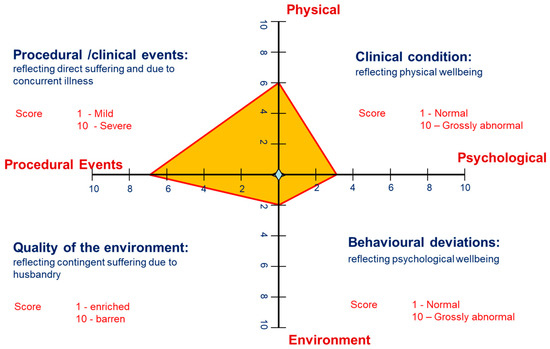 An example of the AWAG showing the four parameters scored on the cruciform grid. In this example, the scores for each parameter are as follows: physical 6; psychological 3; procedural events 7; environment 2. The cumulative welfare assessment score would be calculated from the area of the grid.