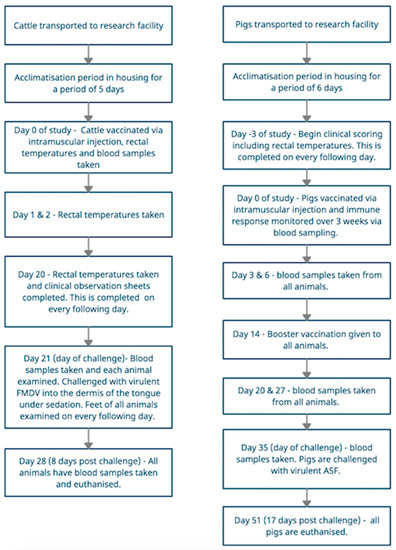 Pigs were vaccinated via an intramuscular injection on day 0 of the study and antibody responses were monitored over 3 weeks by assessing blood samples. If minimum immune response was detected, they were challenged with the virulent ASF virus. Following the initial vaccination, animals were observed at least once daily and clinical signs, including temperature, were recorded on an ASF specific clinical observation scoring sheet. All pigs were euthanised either on reaching the humane end points (which were the same as the scientific end-points) set by the study (details of which can be found in the Appendix A), or on day 17 post-challenge, whichever was sooner. Day 17 post challenge represented the end of the study. Both species were euthanised via an anaesthetic overdose followed by confirmation of cessation of circulation using auscultation. The sequence of events for both animal studies can be seen below in Figure 2.