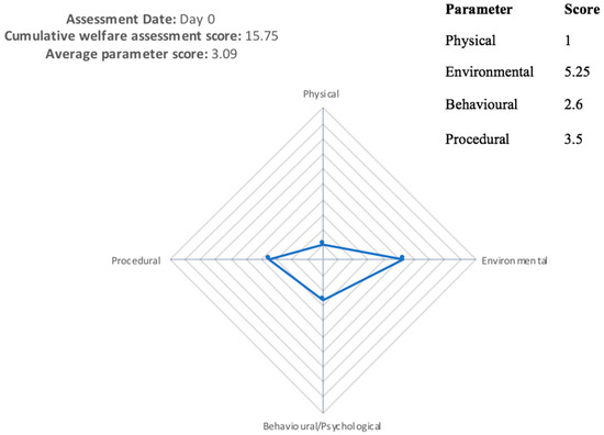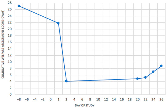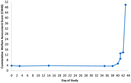 Due to a lack of behavioural data recorded during the study, the true impact of the viral infection is likely to be far greater than is scored on the CWAS graph, demonstrating the need for recording behavioural/psychological factors, as can be seen from Figure 4 and Figure 5. In Figure 4, no behavioural data were available, and the animal receives a cumulative welfare score of 4.13. Figure 5 shows the same animal when behavioural data were available, scoring 15.75. Missing out this information greatly reduces the usefulness of scoring, as an animal which is well habituated to procedures will have a vastly different experience to an animal that is nervous of/aggressive towards human interaction [25].