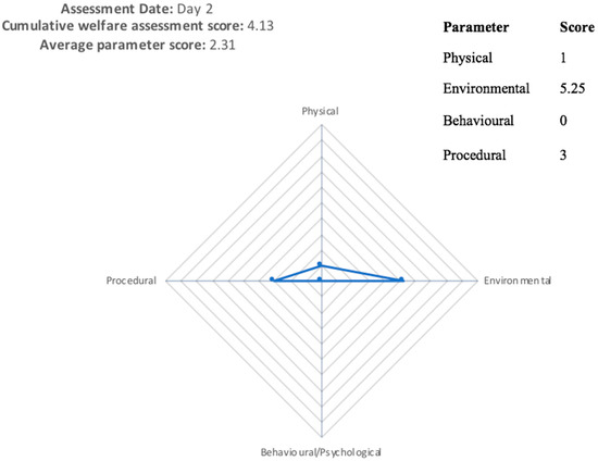 Cruciform grid displaying welfare assessment for a bovine on day 2, undergoing clinical examination (including rectal temperature), showing a cumulative welfare assessment score (CWAS) of 4.13 when behavioural data were unavailable. This CWAS score is calculated from the area of the grid.