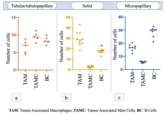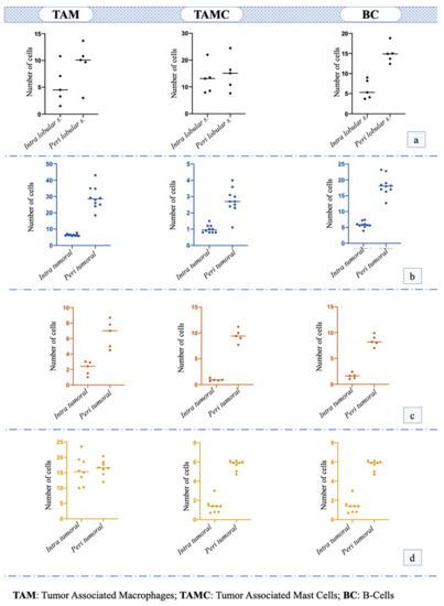 Number and distribution of tumor-associated macrophages (TAM), tumor-associated mast cells (TAMC) and B-cells (BC) in: (a) hyperplasia/dysplasia; (b) tubular or tubulopapillary carcinoma; (c) solid carcinoma; (d) micropapillary carcinoma.
