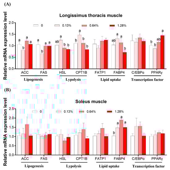 Figure 1 shows the mRNA expression levels of genes associated with lipogenesis (acetyl-CoA carboxylase, ACC; fatty acid synthase, FAS), lipolysis (hormone-sensitive lipase, HSL; carnitine palmitoyl transferase 1B, CPT-1B), lipid uptake (fatty acid transport protein, FATP-1; fatty acid-binding protein 4, FABP4), and transcription factor (peroxisome proliferator-activated receptor γ, PPARγ; CCAAT/enhancer-binding protein α, C/EBPα) in the LTM (Figure 1A) and SM (Figure 1B), respectively.