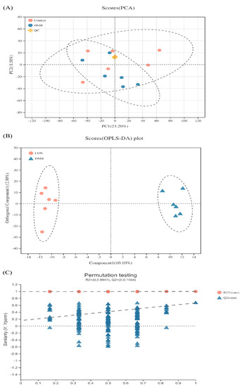 To further determine the slight differences in metabolic profiles among all groups, PCA and OPLS-DA were carried out. As shown in Figure 2A, the scatter plots of serum were cross-distributed among the two groups. Even so, we cannot draw conclusions that no differences were observed in the metabolic profiles of serum among the groups. Supervised OPLS-DA can reveal the specific variables that caused differences among groups relative to unsupervised PCA [28]. Therefore, the multivariate statistical analysis using OPLS-DA was further performed to detect serum-specific metabolites that differ between the CON and HMB treatment, and the scatter plots are presented in Figure 2B. The scatter plots of the CON and HMB groups were distributed in different quadrants, suggesting a significant difference in serum metabolic patterns between the CON and HMB groups.