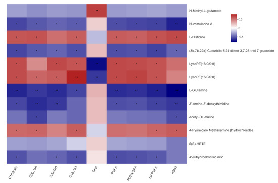 As shown in Figure 4 and Figure 5, N-Methyl-l-glutamate was positively associated with the total SFA content of both LTM and SM (p < 0.01), as well as the n6:n3 ratio in the SM (p < 0.05). Nummularine A was negatively associated with the C18:3n3 content in the LTM and SM (p < 0.05). Of note, the reasons why the number of serum metabolites in Figure 4 and Figure 5 are different from that in Figure 3 are that metabolites in Figure 4 are selected under the condition of VIP ≥ 1.
