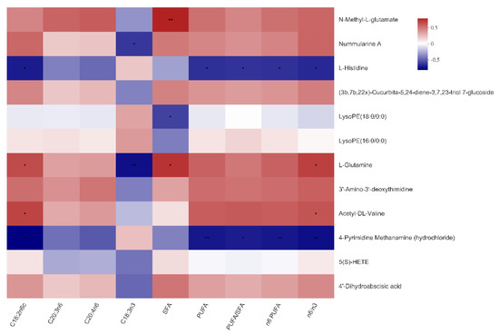 Correlations between serum metabolites and fatty acid composition in the soleus muscle of the Bama Xiang mini-pigs. The top 50 metabolites were selected. Levels of significance are defined as * p < 0.05 and ** p < 0.01.