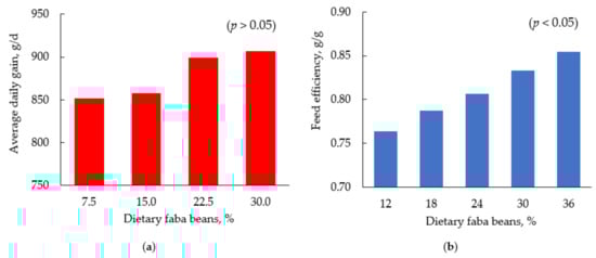 Growth performance of animals fed diets containing faba beans: (a) average daily gain (g/d) of growing pigs at 30 to 60 kg body weight [32]; (b) feed efficiency (g/g) of broiler chickens from 0 to 21 d post hatching [33].