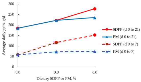 Average daily gain (g/d) of weanling pigs fed diets containing increasing concentration of spray-dried plasma protein (SDPP) or poultry meal (PM) [111]. The average daily gain of pigs fed SDPP (red circle and dashed line) was greater (p < 0.05) than those fed PM (blue triangle and dashed line) on 0 to 7 d; there was no difference in the average daily gain between pigs fed SDPP (red circle and solid line) and pigs fed PM (blue triangle and solid line) on 0 to 21 d.
