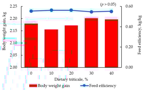 Body weight gain (kg) and feed efficiency (kg/kg) of broiler chickens fed diets containing increasing concentration of triticale from 1 to 42 d post hatching [57].