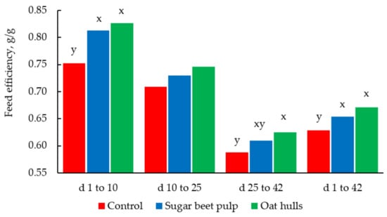 Feed efficiency (g/g) of broiler chickens fed diets containing sugar beet pulp or oat hulls from 1 to 42 d post hatching [62]. Means within the period without a common letter differ (p < 0.05).