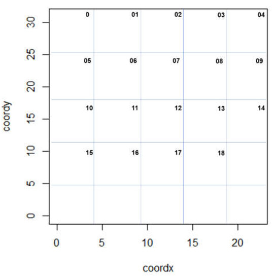 In addition, aiming a better understanding about the manure deposition from congregate in in possible better ventilated areas, we divided the barn in a grid of 18 quadrants uniformed distributed (Figure 1). We registered the positioning of animals (multiparous and primiparous cows) during the behavioural assessment. With this information, a grid map with the positioning frequency was built during the following periods of day: 09:00, 12:00, and 15:00 h.