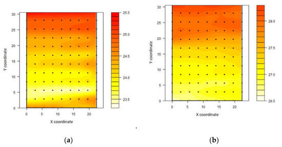 Through kriging maps, it was possible to demonstrate that air temperature ranged from 23.3 to 25.5 °C and from 26.5 to 28.3 °C in the first and second measurement intervals, respectively (Figure 2).