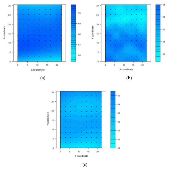 Spatial distribution of relative humidity (%) in compost-bedded pack barn between 09:00 and 12:00 h (a), between 12:00 and 15:00 h (b), and between 15:00 and 18:00 h (c).