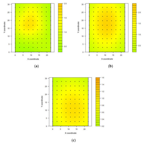 Kriging maps for wind speed (Figure 4) show that the values ranged from 0.3 to 2.0 m s−1 in the first interval, from 0.2 to 2.4 m s−1 in the second interval, and from 0.2 to 1.6 m s−1 in the third measurement interval.