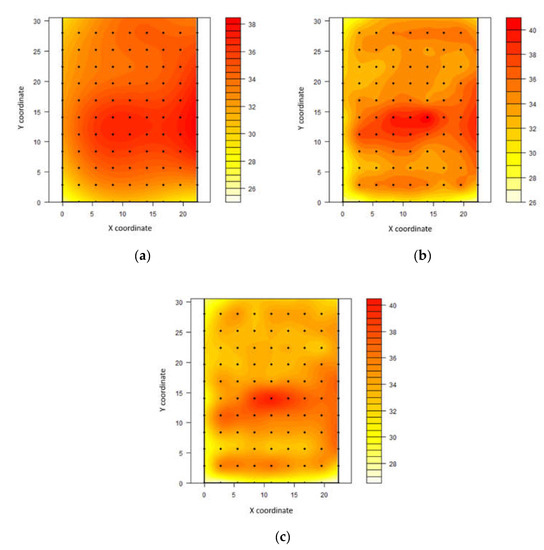 Spatial distribution of bed temperature (°C) in a compost-bedded pack barn between 09:00 and 12:00 h (a), between 12:00 and 15:00 h (b), and between 15:00 and 18:00 h (c).