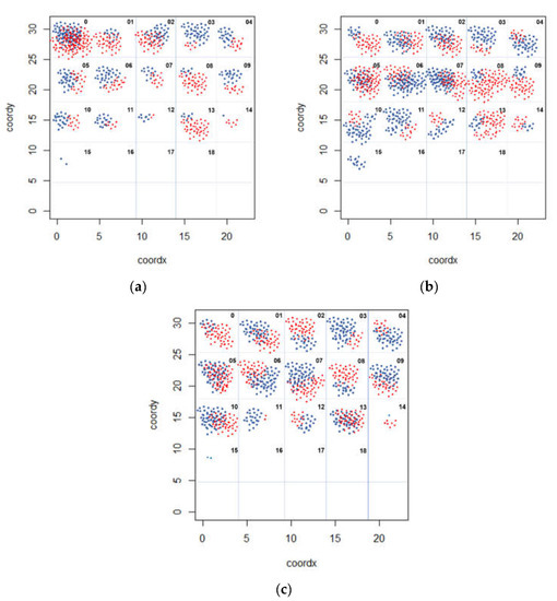 Grid map of the frequency positioning of the animals (primiparous cows—blue dot; multiparous cows—red dot), at 09:00 and 12:00 h (a), between 12:00 and 15:00 h (b), and between 15:00 and 18:00 h (c).