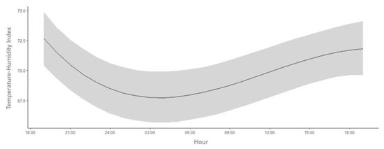 Higher THI values were observed between 09:00 and 18:00 h and lower values between 24:00 and 06:00 h. The thermal environment of the compost barn presented values lower than 68 between 01:30 and 06:00 h and values between 68 and 75 at other times of the day (Figure 7).