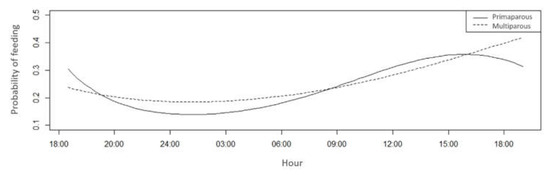 Based on Bayesian comparisons, the feeding behaviour of primiparous and multiparous cows during the day differed (p < 0.05) (Table 4). The pattern of demand for food appeared to have been influenced by milking hours, subsequent feeding, and the thermal conditions of the barn. Multiparous cows were more likely to feed at night and in the early hours of the day, between 8:00 and 20:00 h, whereas primiparous cows were more likely to eat during the day, after 9:00 until approximately 15:00 h (Figure 8).