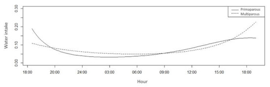 Water intake probability of primiparous (solid line) and multiparous cows (dotted line) in a compost barn.