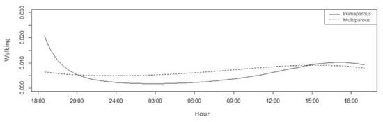 Walking probability of primiparous (solid line) and multiparous cows (dotted line) in a compost barn.
