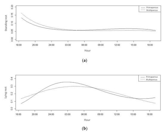 Standing rest (a) and lying rest (b) probability of primiparous (solid line) and multiparous cows (dotted line) in a compost barn.