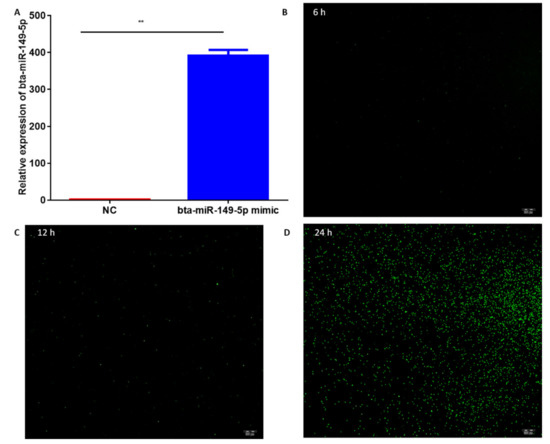 To explicate regulatory function of bovine bta-miR-5p in adipogenesis, we analyzed the mimic efficiency of bta-miR-149-5p in bovine adipocytes. The expression level of bta-miR-149-5p in cells transfected with bta-miR-149-5p mimic was significantly (p < 0.01) increased as compared to mimic NC (Figure 1A). Before analyzing the mimic efficiency, we detected the transfection efficiency of the miRNA through FAM-labeled negative control miRNA (gene pharma, Shanghai, China). The transfection efficiency was evaluated at 6-, 12-, and 24-h intervals. The transfected adipocytes were observed under fluorescence microscope, and the photographs were captured though Olympus IX71 microscope (OLYMPUS, Tokyo, Japan) (Figure 1B–D). These findings confirmed the accuracy and success of the transfection experiment performed in the current study and authenticated the reliability of data in subsequent experiments.