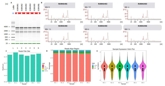 The RNA quality shows RNA integrity number (RIN) ranged from 7.5 to 10 (Figure 2A). These figures show integrity of the RNA samples used in the current study. Moreover, sequenced clean reads were filtered (Figure 2C) and aligned with ribosome RNA (rRNA) and reference genome (Figure 2D) for purification and normality of the data for subsequent analysis. The expression abundance also confirmed the significance of the transcriptomic analysis of the samples (Figure 2E).