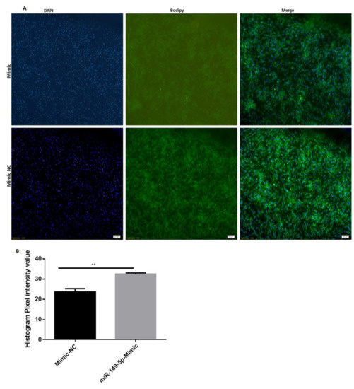The lipid droplets (LDs) on day 9 of differentiation were assessed using BODIPY staining (Figure 3). The adipocytes transfected with bta-miR-149-5p mimics exhibited decreased level of LDs as compared with adipocytes transfected with mimic NC. The histogram pixel intensity also showed significant (p < 0.01) reduction in LDs in adipocytes transfected with bta-miR-149-5p mimics as compared with mimic NC. These results illustrate the fact that bta-miR-149-5p inhibited differentiation of bovine adipocytes.