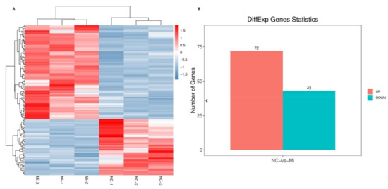 Deep RNA-sequencing analysis revealed that bta-miR-149-5p significantly affected expression of adipogenic marker genes in differentiated bovine adipocytes transfected with bta-miR-149-5p mimic and mimic NC (Figure 4A–C). In total, there were 115 DEGs (differentially expressed genes), with 1.5 ± |FC and (log2 (fc) > 0.58496/log 2 (fc) > 0.58496 and p-value (<0.05). These 115 DEGs contain 72 upregulated and 43 downregulated genes in bovine differentiated adipocytes (Table S2).