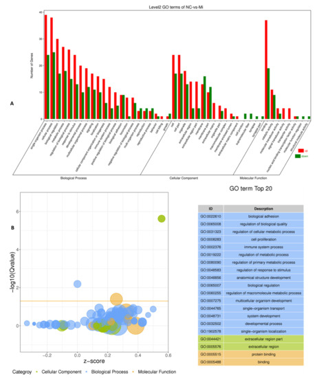 The bta-miR-149-5p significantly changed the GO terms in bovine adipocyte transfected with bta-miR-149-5p mimics and mimics NC (Figure 5A). The unigenes and GO term biological processes were the most annotated unigene contributor part with 80.08%, followed by cellular component (13.4%) and molecular function (6.7%). The top 20 GO terms due to DEGs are shown in Figure 5B. The DEGs significantly altered the GO term GO:0044421 extracellular region part and GO:0005576 extracellular region in cellular component GO ontologies. The GO terms altered in molecular function ontologies in the top 20 GO terms were GO:0005515 protein binding and GO:0005488 binding. The most important GO terms altered in cellular component ontologies in the top 20 GO terms were GO:0031012 extracellular matrix, GO:0005125 cytokine activity, GO:0005102 receptor binding, GO:0016787 hydrolase activity, GO:0022610 biological adhesion, GO:0065008 regulation of biological quality, GO:0031589 cell−substrate adhesion, GO:0031323 regulation of cellular metabolic process, GO:0042326 negative regulation of phosphorylation, and GO:0042325 regulation of phosphorylation in bovine adipocytes.