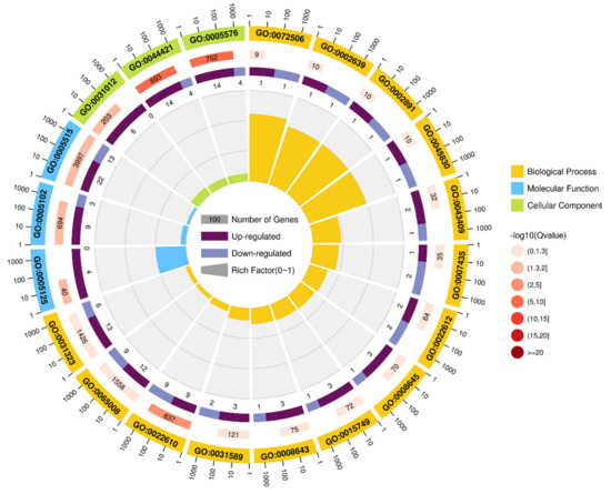 The DEGs were mapped into GO terms through GO enrichment analysis using the GO database available at http://www.geneontology.org/ (accessed on 20 April 2021). The significantly enriched GO terms in the DEGs correspond to the respective biological functions. Hypergeometric test was used for the calculation of gene numbers for each term in comparison with the reference genome using the following formula: