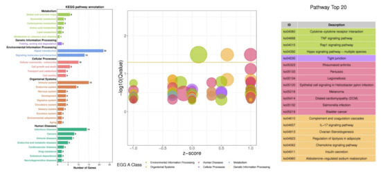 The KEGG pathway analysis of DEGs in 2 groups of bovine adipocytes transfected with bta-miR-149-5p (n = 3) mimics and mimics NC (n = 3). The KO enrichment difference bubble chart: the ordinate is -log10 (Qvalue), the abscissa is the z-score value (the difference between the number of upregulated genes and the number of downregulated genes accounts for the proportion of the total differential genes), and the yellow line represents Qvalue = 0.05 threshold. On the right is the list of pathways with the top 20 Q values. Different colors represent different A classes.