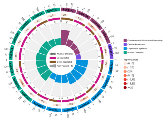 KO enrichment circle diagram of the KEGG_A_class: The first circle: the first 20 pathways of enrichment; outside the circle is the coordinate ruler of the number of genes. Different colors represent different A classes. The second circle: the number of pathways in the background genes and the Q value. The more genes, the longer the bar, the smaller the Q value, the redder the color. The third circle: the bar graph of upregulated gene ratio, wherein dark purple represents the upregulated gene ratio and light purple represents the downregulated gene ratio; the specific value is shown below. The four circles: Rich factor value of each pathway (the number of differences in the pathway divided by all the numbers); background grid lines each grid represent 0.1.