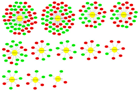 The distribution of up- and downregulated DEG enrichment in different KEGG (Kyoto Encyclopedia of Genes and Genomes) pathways. The pathway nodes are represented by pathways (yellow), downregulated genes (green), and upregulated genes (red), which are shown as circles.