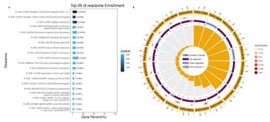 Top 20 reacrome enrichment pathways. (A) Reactome enrichment bar graph: the top 20 reactome channels with the smallest Q value to plot; the ordinate is the reactome channel, and the abscissa is the percentage of the number of reactome channels in all the DEGs. The darker the color, the smaller the Q value. The value on the column is the number of reactome channels and the Q value. (B) Reactome enrichment circle diagram: the first circle: the top 20 reactome pathways of the enrichment; outside the circle is the coordinate ruler of the number of genes. The second circle: the number of the reactome pathway in the background gene and the Q value. The more the genes, the longer the bars, the smaller the Q value, and the redder the color. The third circle: the bar graph of upregulated gene ratio, wherein dark purple represents the upregulated gene ratio and light purple represents the downregulated gene ratio; the specific value is shown below. The fourth circle: each reactome pathway Rich factor value (the number of differences in the reactome channel divided by all the numbers); in terms of background grid lines, each grid represents 0.1.